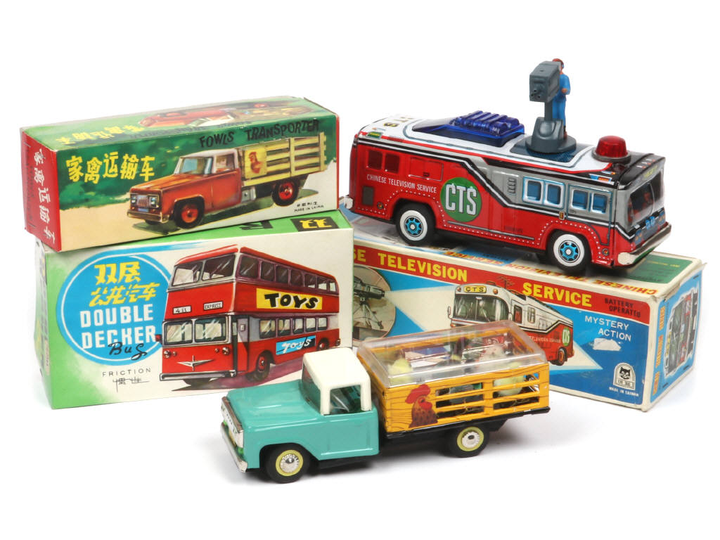 avec 2 moteurs à friction (fonctionnels) & un moteur à piles (fonctionne) - comprend : bus de la télévision chinoise, bus double decker & camionnette transport de volailles