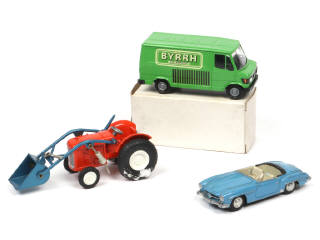comprend : FIAT tracteur agricole avec benne preneuse (pneus plus ou moins poisseux), MERCEDES 207D camionnette 'BYRRH' (PROMOTIONNEL) & cabriolet 190 SL (une partie de pare brise cassée & manquante - couvre-capote repeint) - on y retrouve les marques : CONRAD, GAMA & MÄRKLIN - 2 modèles en boite en état 'b' & 'c'