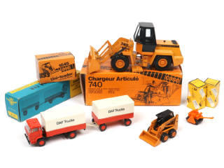 comprend notamment les modèles : camion DAF bâché 'DAF TRUCK' avec remorque, chargeur articulé 'CASE' (quelques retouches & éléments à repositionner) & UNI-LOADER - on y retrouve les marques : NZG, LION-CAR & LOSENHAUSEN