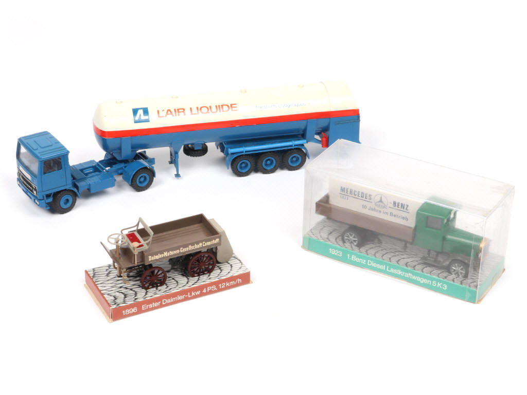 comprend les modèles : ERSTER-DAIMLER, BENZ & BEDFORD (manque sellette d'attelage) - on y retrouve les marques : CURSOR MODELL & CONRAD - 2 modèles en boite (états 'b' & 'c')