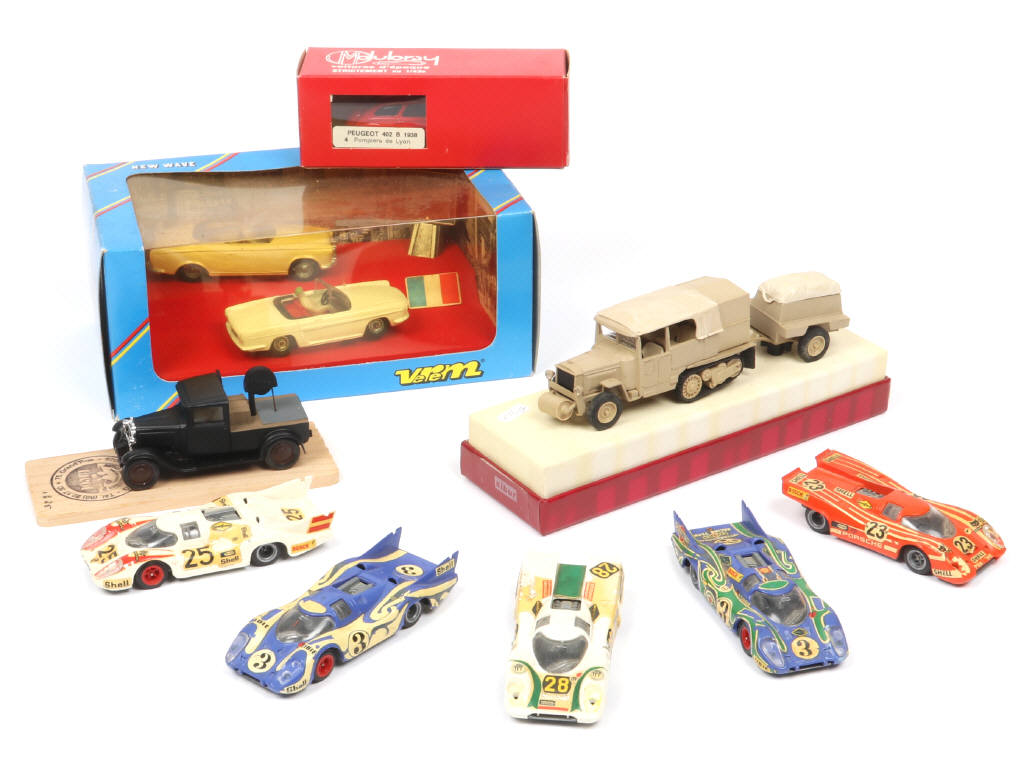 légèrement encrassé - comprend notamment les modèles : RENAULT, PORSCHE, CITROEN & PEUGEOT - quelques manques & parties cassées - on y retrouve les marques : SOLIDO (transkit), VEREM, CHAMPION, SIBUR & DUBRAY - 4 modèles en boite en état 'b' & 'd' (manque un couvercle)