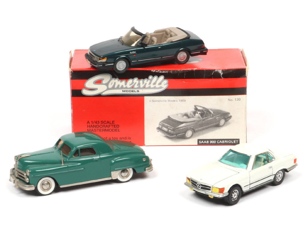 comprend : SAAB 900 cabriolet, DODGE WAYFARER coupé 1950 & MERCEDES 350 SL (quelques détails ajoutés) - un modèle en boite (état 'c') - on y retrouve les marques : BROOKLIN, SOMERVILLE & CORGI TOYS