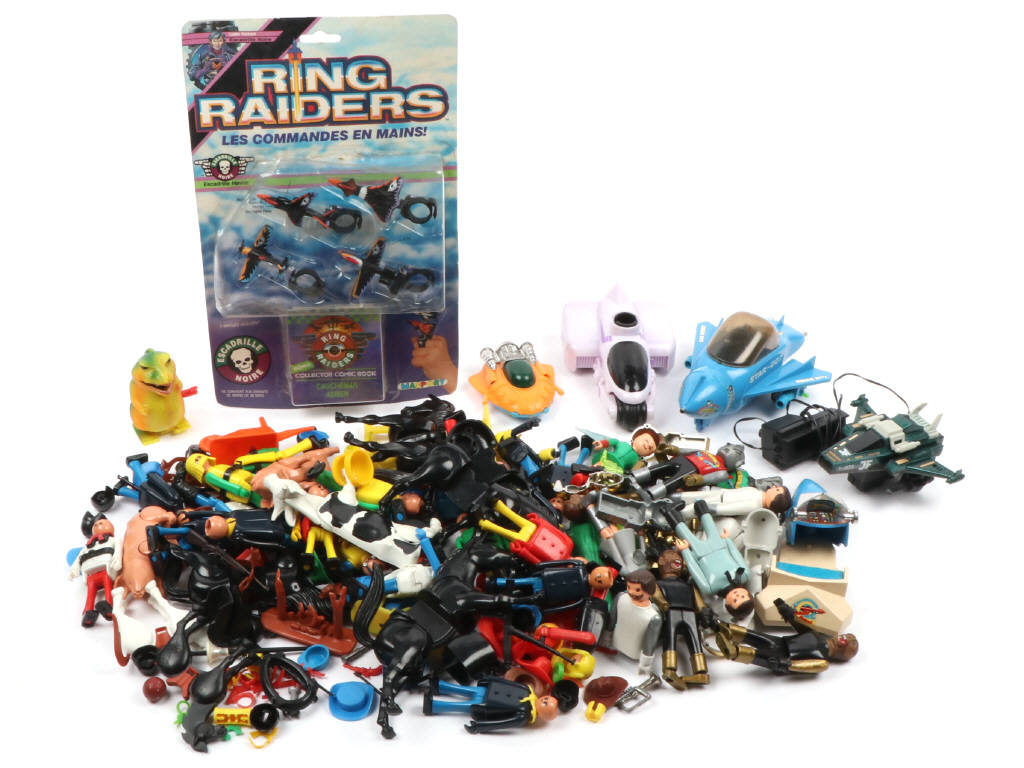 on y retrouve notamment l'univers PLAY BIG & GALAXY PATROL - avec manques & parties cassées - on y joint un blister RING RAIDERS jamais ouvert état 'A.b' (encrassé, blister déformé & carte avec accrocs) - on y retrouve notamment les marques MATCHBOX & PLAYBIG