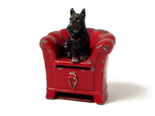 hauteur 9 cm - en fonte d'aluminium & en métal - manque vraisemblablement une attache sur la trappe située sous le fauteuil - fabriqué à CHICOUTIMI au QUEBEC - 9 cm tall - cast aluminium & metal - apparently missing an attachment from the trap door found underneath the chair - made in Chicoutimi, Quebec