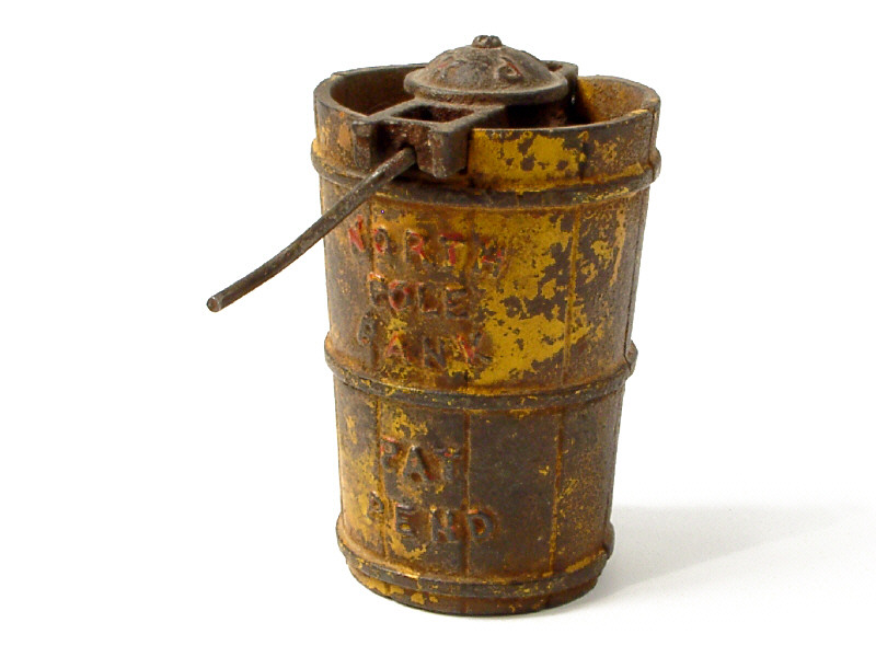 hauteur 11 cm - en fonte - avec inscriptions 'SAVE YOUR MONEY AND FREEZE IT - NORTH POLE BANK' - modèle s'ouvrant en 2 parties avec vis située sur un des côtés de la machine - manque trappe située sous la tirelire - 11 cm tall - cast iron - with the inscription 'SAVE YOUR MONEY AND FREEZE IT - NORTH POLE BANK' - model opens up into 2 halves held together by a screw underneath