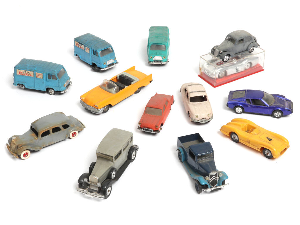 miniatures reproduisant notamment les modèles : MERCEDES (en boîte état 'c'), CITROËN, FIAT & RENAULT - avec manques parties cassées & jantes fondues (plus ou moins importants suivant les modèles) - ensemble très encrassé - un modèle transformé