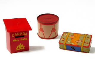 hauteur 7,5 cm - en tôle - cette boîte ne comporte aucune trappe permettant de récupérer les pièces - il fallait l'ouvrir à l'aide d'un ouvre-boîte lorsqu'elle était pleine - 7.5 cm tall - tinplate - there is no cover allowing you to get the money back out again - you had to wait until it was full, then open it with a tin-opener