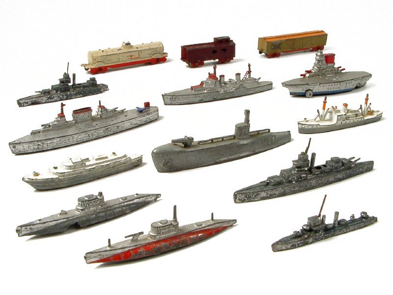états de 'E' à 'F' - comprend : 3 sous-marins, 2 porte-avions, un paquebot, un cargo, un cuirassé, 2 croiseurs & une vedette - on y retrouve notamment la marque TOOTSIETOY