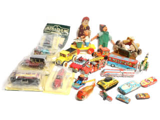 différentes échelles - jouets mécaniques en fer-blanc pour la plupart - comprend notamment les modèles : voitures de courses, train, véhucules de secours & pantins de bois - 5 modèles sous blisters non ouverts - possibilité de petits manques & parties cassées