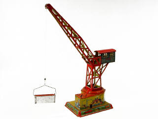 hauteur 49,5 cm - moteur à clef (fonctionne) - avec manette permettant de diriger la grue (la manoeuvre de pivotement fonctionne poussivement) - avec benne - 49.5 cm tall - wind-up mechanism (in working condition) - with handle allowing you to direct the crane (mechanisms work wheezily)