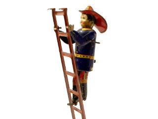 hauteur du pompier 20 cm - mécanisme à ressort (à revoir) - en action, le pompier monte sur son échelle - 20 cm tall - clockwork mechanism (subject to verification) - in action, the fireman goes up the ladder