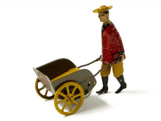 longueur 14 cm - en tôle lithographiée - moteur à ressort (fonctionne) - en action, le fermier avance tout en poussant sa brouette tandis que ses jambes bougent - 14 cm long - lithographed tinplate - clockwork mechanism (in working condition) - in action, the farmer pushes his wheelbarrow - SCARCE