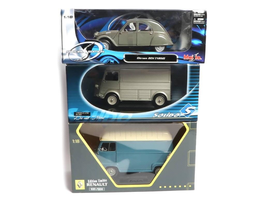 échelle : 1/18ème - comprend les marques : SOLIDO, MAISTO & NOREV - on y retrouve les modèles : RENAULT ESTAFETTE RÉHAUSSÉE (Édition limitée 1051/1200), CITROËN 2CV & CITROËN HY VITRE