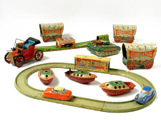 états de'C' à 'E' - comprend : un petit circuit routier avec 2 voitures, 3 canots 'POP-POP' avec moteurs à bougie, 3 chariots du Far West 'CHISHOLM TRAIL', un char de combat M-58, un petit circuit incomplet & un tacot avec moteur à inertie - on y retrouve notamment les marques : TM, CK & PN - quelques petits manques & traces d'oxydation sur certains éléments - from 'C' to 'E' condition - includes; a road circuit with 2 cars, 3 'POP-POP' boats with candle engines, 3 'CHRISHOLM TRAIL' coaches, an M-58 tank, a small incomplete circuit & jalopy - the makes TM, CK & PN are present - some small parts missing & slight rust on certain models