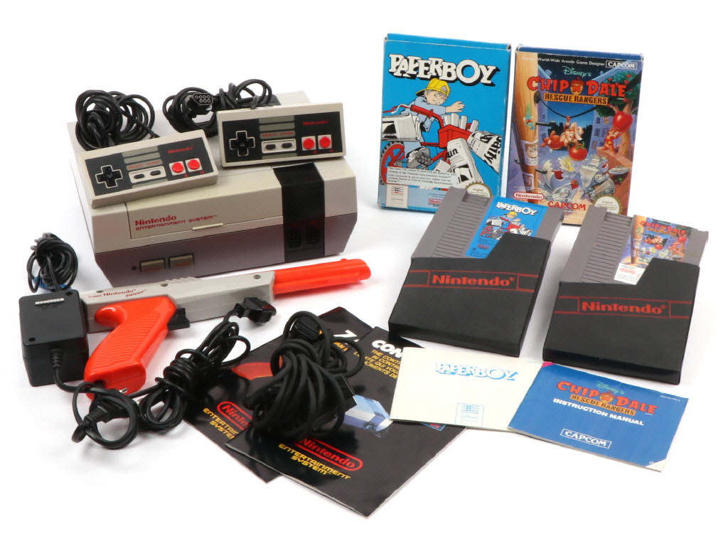 testé fonctionne (avec notices) - comprend : NINTENDO NES (avec deux manettes, cable alimentation, cable video & pistolet - console légèrement jaunie par endroit) - avec les jeux : PAPERBOY & CHIP N DALE - boites avec accrocs & frottements plus où moins importants