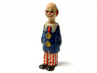 hauteur 15,5 cm - moteur à clef (fonctionne) - en action, le personnage se met à vibrer tandis que son corps & son cou s'allonge & que ses yeux s'ouvrent puis se referment - 15.5 cm tall - wind-up mechanism (in working condition) - in action, the clown starts to shake & his neck and body extend as his eyes open & shut