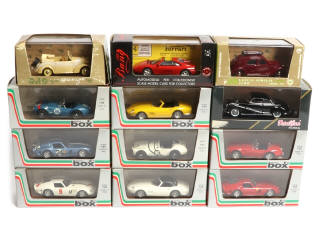 comprend les marques : MODEL BOX, BANG, DETAILCARS & BRUMM - on y retrouve notamment les modèles : FERRARI 348 TS, BMW 502 coupé, SHELBY COBRA & FERRARI 275 GTB/4 - boîtes en états 'b' à 'c'