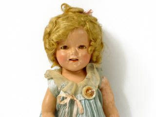 hauteur 57 cm - articulée - yeux mobiles bleus (couleur passée) - perruque blonde - bouche ouverte avec dents - avec petite robe bleue, jupon, chaussettes & petites chaussures en peau - craquelures avec petites parties de verni manquantes - avec un badge épinglé représentant une photographie du personnage - poupée représentant une célèbre actrice américaine des années 1930-1940 - 57 cm tall - moving limbs & blue eyes (faded) - blond wig - open mouth with teeth - blue dress, underskirt, socks & shoes - cracks & small parts of the varnish missing - with a badge with the photo of the character on it - the doll represents a famous American actress of the 1930s-40s