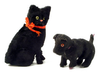 hauteur 16 cm - moteur à ressort (fonctionne) - en action, l'animal vibre, ouvre la gueule, remue la queue & ronronne légèrement - une couture de fourrure décousue & un oeil fendu - 16 cm tall - clockwork mechanism (in working condition) - in action, the cat vibrates, opens its mouth, wags its tail & purrs gently - one of the fur seams undone & an cracked eye