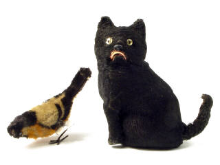 hauteur 13,5 cm - moteur à ressort (fonctionne) - en action, l'animal vibre, ouvre la gueule, remue la queue & ronronne - 13.5 cm tall - clockwork mechanism (in working condition) - in action, the animal vibrates, opens its mouth, wags its tail & purrs
