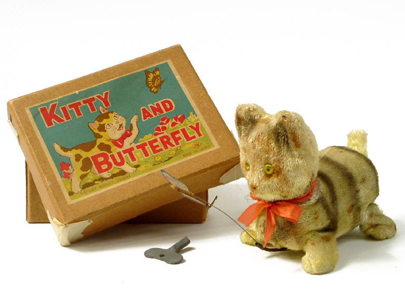 longueur 15 cm - moteur à clef (fonctionne) - avec clef - en action, l'animal avance lentement puis se met à courir derrière le papillon qui est fixé par un fil de fer - manque nez du chat & fourrure légèrement rapée - 15 cm long - wind-up mechanism (in working condition) - with key - in action, the cat moves forward slowly, then runs after the butterfly that is fixed by a metal thread - cat's nose missing & minor bald spots