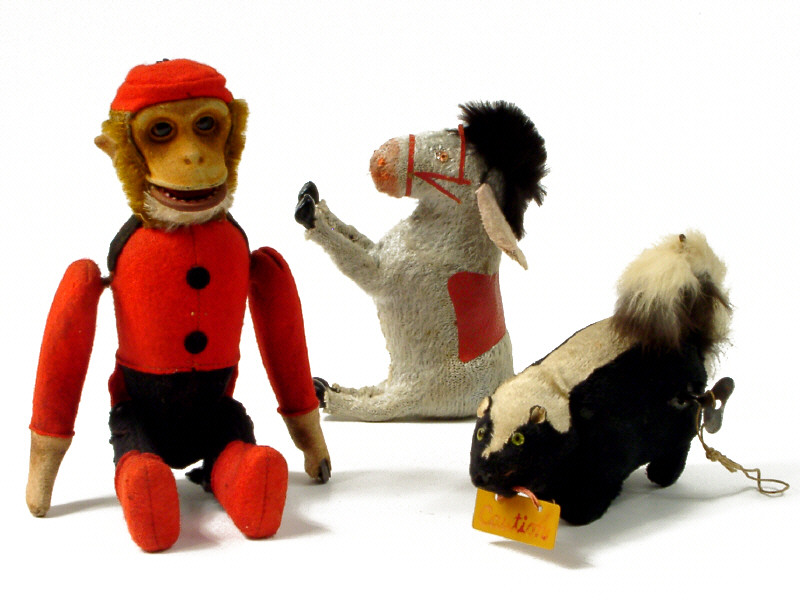 longueur 17,5 cm - moteur à ressort (fonctionne) - en action, l'animal remue la queue & les oreilles - 3 pattes cassées & arrière-train enfoncé - fourrure rapée - 17.5 cm long - clockwork mechanism (in working condition) - in action, the donkey wags his tail & ears - 3 feet broken & slightly unstable posture - bald spots on the fur