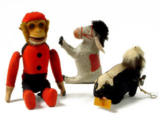 longueur 17 cm - moteur à ressort (fonctionne) - avec petite étiquette 'CAUTION' dans la gueule du putois - en action, l'animal avance en bougeant la tête & la queue - fourrure poussiéreuse - manque le nez de l'animal - 17 cm long - clockwork mechanism (in working condition) - with a 'CAUTION' label in the skunk's mouth - in action, the skunk moves forward waving his head & tail - fur dusty - nose missing