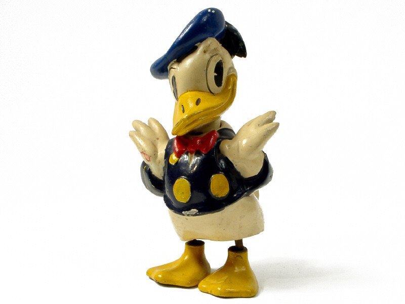 hauteur 21 cm - moteur à ressort (fonctionne poussivement) - en action, DONALD se dandine & balance sa tête - légères craquelures sur le dos du personnage - 21 cm tall - clockwork mechanism (works wheezily) - in action, Donald waddles & rocks his head from side-to-side - minor cracks on his back - SCARCE