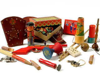 comprend : un revolver à ressort, une boîte contenant des pions & jetons en bois, un diabolo en bois, un ceinturon avec 2 étuis à revolvers en cuir, 2 manchettes en cuir, un jouet de jonglage en bois, 2 jeux de cartes, 3 sifflets en bois (factices), 2 kaléidoscopes, un étui décoré contenant 8 casses-tête chinois, 2 sifflets en métal, un pointeau & un grand crayon de papier - contains : a gun, a box containing pawns & wooden counters, a wooden diabolo, a leather 2-gun holster, 2 leather wrist cuffs - a wooden juggling game, 2 card games, 3 wooden whistles (imitation), 2 Kaleidoscopes, a decorated box containing 8 trick games , 2 metal whistles, a pointer & a large pencil