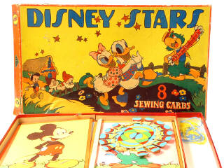 contient : 7 cartes représentant différents personnages de Walt Disney & un chevalet (incomplet) - includes; 7 sewing cards with different Disney characters (incomplete)