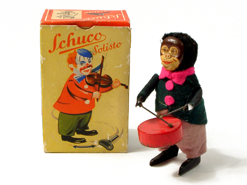 hauteur 11 cm - moteur à clef (fonctionne) - avec clef non d'origine - en action, le singe joue du tambour tout en tournant sur lui-même - mécanisme des bras à revoir - boîte de la référence 986/1 (clown jouant du tambour) - 11 cm tall - wind-up mechanism (in working condition) - with key (not original) - in action, the monkey plays the drum whilst turning in a circle - mechanisms in the arms subject to verification - box reference 986/1(Clown playing the drum) - SCARCE