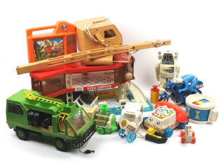 comprend notamment : un garage, une grue en bois, un téléphone & un robot - on y retrouve notamment les marques FISHER PRICE, ESSO & VULLI - avec manques & parties cassées