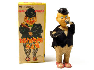 hauteur 19 cm - moteur à ressort (fonctionne) - en action, le personnage remplit son verre puis le porte à ses lèvres tout en bougeant la tête - avec cale de boîte - manque vraisemblablement l'étiquette de la bouteille - 19 cm tall - clockwork mechanism (in working condition) - in action, the character fills his glass, then lifts it to his mouth as he moves his head - with box insert - apparently missing the bottle label