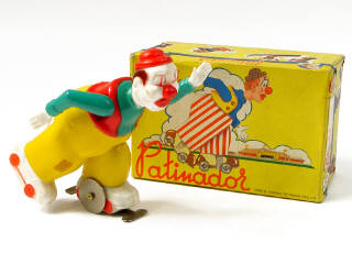 hauteur 16 cm - en plastique - moteur à clef (fonctionne) - en action, le clown avance en patinant & tourne sur lui-même - 16 cm tall - plastic - wind-up mechanism (in working condition) - in action, the clown skates foward & turns in a circle