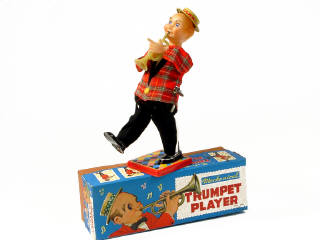 hauteur 25 cm - mécanisme à ressort (fonctionne) - en action, le trompettiste remue en avant & en arrière sur sa jambe gauche tandis que sa tête bouge & que son chapeau se soulève - 25 cm tall - clockwork mechanism (in working condition) - in action, the trumpetist rocks from front to back on his left leg whilst his head moves & his hat rises