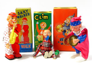 hauteur 22 cm - en plastique - moteur à ressort (fonctionne) - en action, le clown avance tout en jouant du saxophone - 22 cm tall - plastic - clockwork mechanism (in working condition) - in action, the clown moves forward whilst playing the saxophone