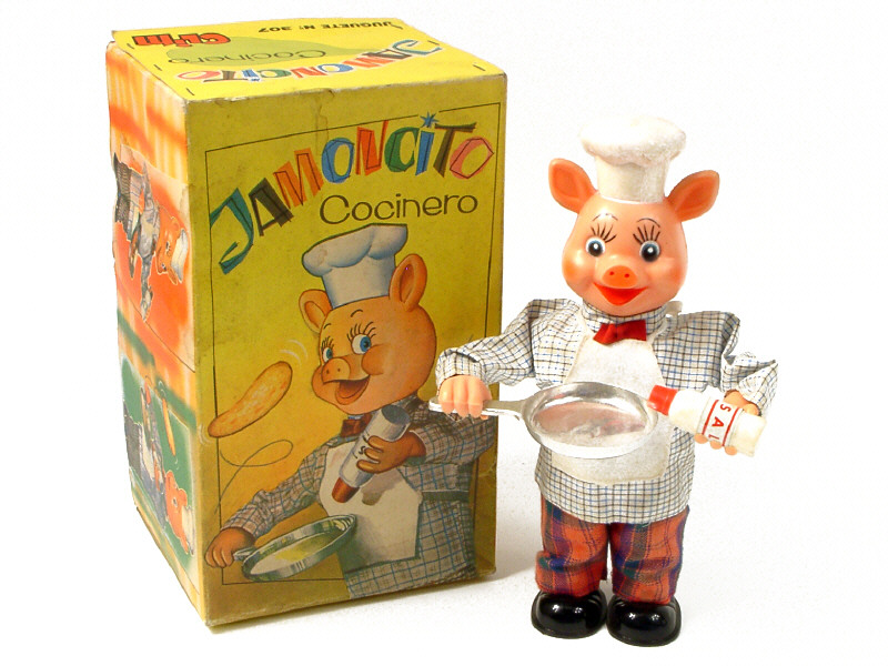 hauteur 25 cm - en plastique - moteur à ressort (fonctionne) - en action, le cochon sale sa crêpe tout en la faisant sauter dans la poêle (manque crêpe) - une tâche d'humidité sur la boîte - 25 cm tall - plastic - clockwork mechanism (in working condition) - in action, the clown tosses his crepe & adds salt (crepe missing) - water marks on the box