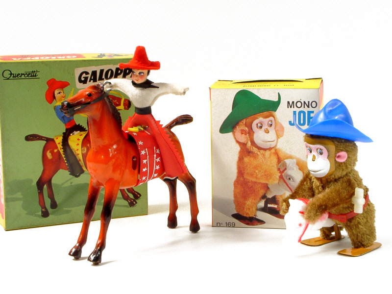 hauteur 17 cm - en plastique - moteur à clef (fonctionne) - avec clef - en action, le cow-boy fait du rodéo sur son cheval - 17 cm tall - plastic - wind-up mechanism (in working condition) - with key - in action, the cowboy does the rodeo