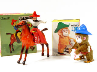 hauteur 13,5 cm - en plastique & tôle - moteur à ressort (fonctionne) - en action, le singe se balance en avant & en arrière - 13.5 cm tall - plastic & tinplate - clockwork mechanism (in working condition) - in action, the monkey rocks back & forth