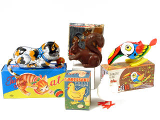 hauteur 10 cm - en plastique - moteur à clef (fonctionne) - en action, l'animal avance en sautillant - 10 cm tall - plastic - wind-up mechanism (in working condition) - in action, the squirrel jumps forward