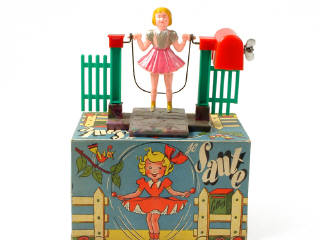 hauteur 13 cm - en plastique - moteur à ressort (fonctionne) - en action, la fillette saute à la corde entre 2 barrières