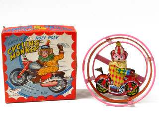 diamètre 15 cm - en tôle lithographiée - moteur à ressort (fonctionne de manière aléatoire) - en action, le singe fait des acrobatie sur sa moto à l'intérieur d'une cage ronde - avec bruiteur - 15 cm diametre - lithographed tinplate - clockwork mechanism (in working condition on a random basis) - in action, the monkey performs acrobatics on his bike inside the hoops - with sound effects