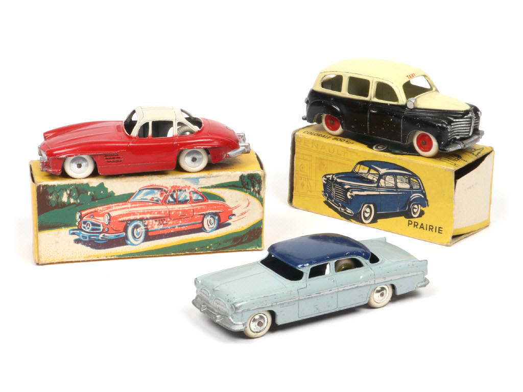 comprend : CHRYSLER WINDSOR & RENAULT PRAIRIE 'TAXI' (version avec plancher pincé - boite en état 'd' - manque 2 rabats) - pneus séchés - on y joint une MERCEDES 300 SL de la marque QUIRALU (modèle original - boite en état 'c' avec frottements)