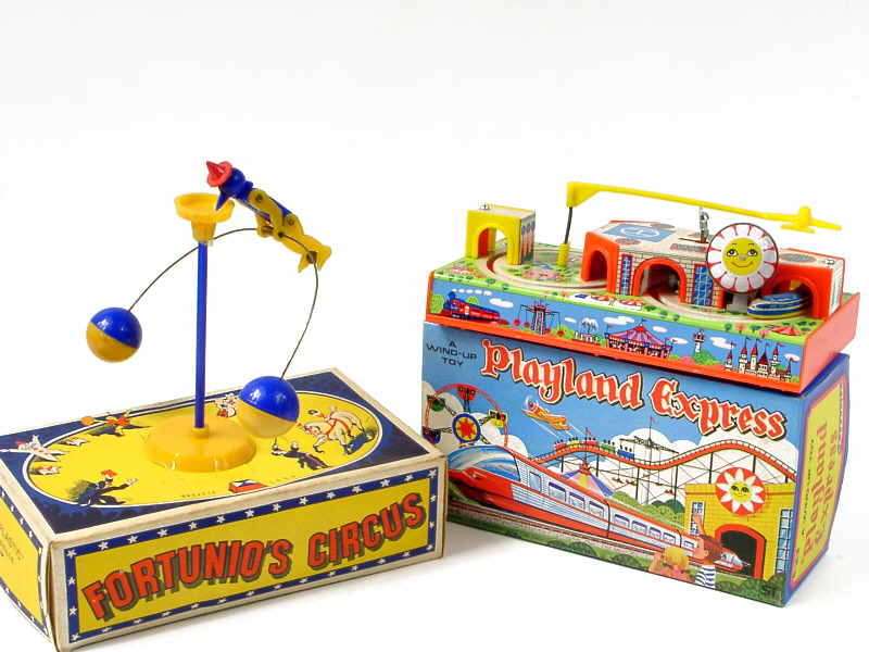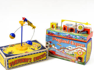 dimension 20 x 10,5 cm - en tôle lithographiée & plastique - moteur à ressort (fonctionne) - en action, 2 autorails circulent à travers un parc d'attraction en passant sous des tunnels tandis qu'un avion survole le parc - avec bruiteur - 20 x 10.5 cm - lithographed tinplate & plastic - clockwork mechanism (in working condition) - in action, the 2 trains travel round the fun park going through tunnels whilst a airplane flies overhead - with sound effects