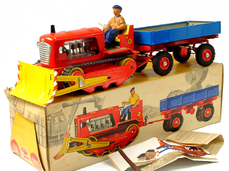 M.S. (ALLEMAGNE) 5015 Bulldozer avec remorque à ridelles basculante rouge, jaune & bleu