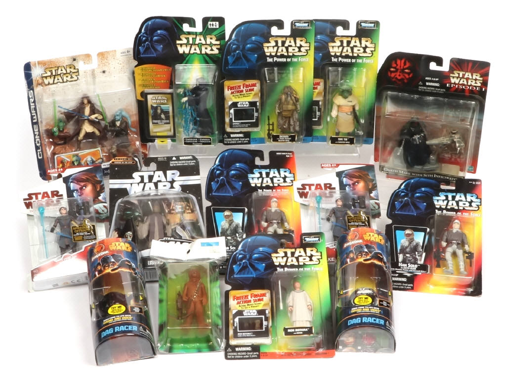 scellé - comprend notamment : MON MOTHMA, HAN SOLO, LUSHROS DOFINE, ZUCKUSS & ISHI TIB - on y retrouve les marques HASBRO & KENNER - boites avec petits accrocs & frottements