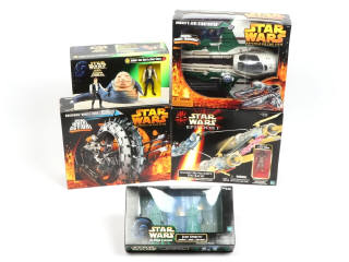 scellé - comprend : JABBA THE HUTT 1 HAN SOLO réf : 69742, GRIEVOU'S WHEEL BIKE réf : 85348, ANAKIN'S JEDI STARFIGHTER réf : 32164, ANAKIN SKYWALKER'S POD RACER réf : 84020 & set JEDI SPIRITS réf : 84035 - on y retrouve les marques HASBRO & KENNER - boites avec petits accrocs & frottements