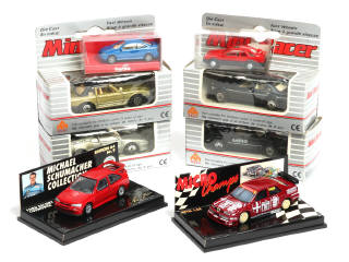 petites échelles - miniatures reproduisant les modèles : ALFA ROMEO, MERCEDES, FORD, OPEL, MERCEDES, TOYOTA & BMW - on y retrouve les marques : M.C TOYS, HERPA & MINICHAMPS (couvercles de boîtes plus ou moins opacifiés)