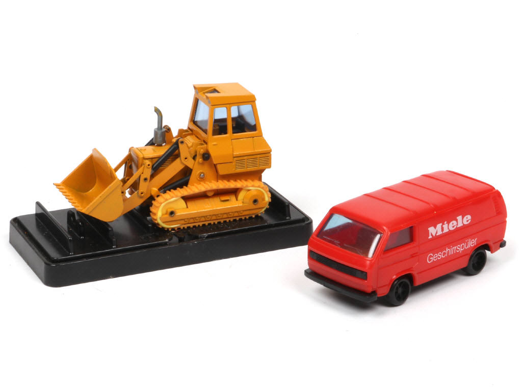 comprend : VOLKSWAGEN COMBI 'MIELE' (PROMOTIONNEL !) & CATERPILLAR benne-preneuse sur chenilles (barbotins légèrement fondus - quelques petits éclats sur la pelle - boite avec fêlures) - on y retrouve les marques : NZG & DOM-PLASTIK