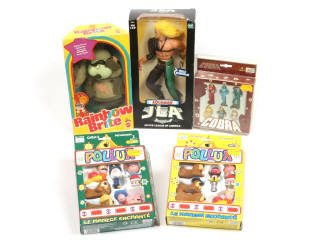 scellé - comprend : GRISEMINE RAINBOW BRITE réf : 7243, 2 coffrets de figurines en PVC POLLUX (réf : 100104 & 100103), set de figurines COBRA réf : 300101 & AQUAMAN réf 26021 - on y retrouve les marques HASBRO, AB TOYS & MATTEL - boites en états 'b' avec accrocs, frottements & petits manques de papier (3 boites avec étiquettes de prix)